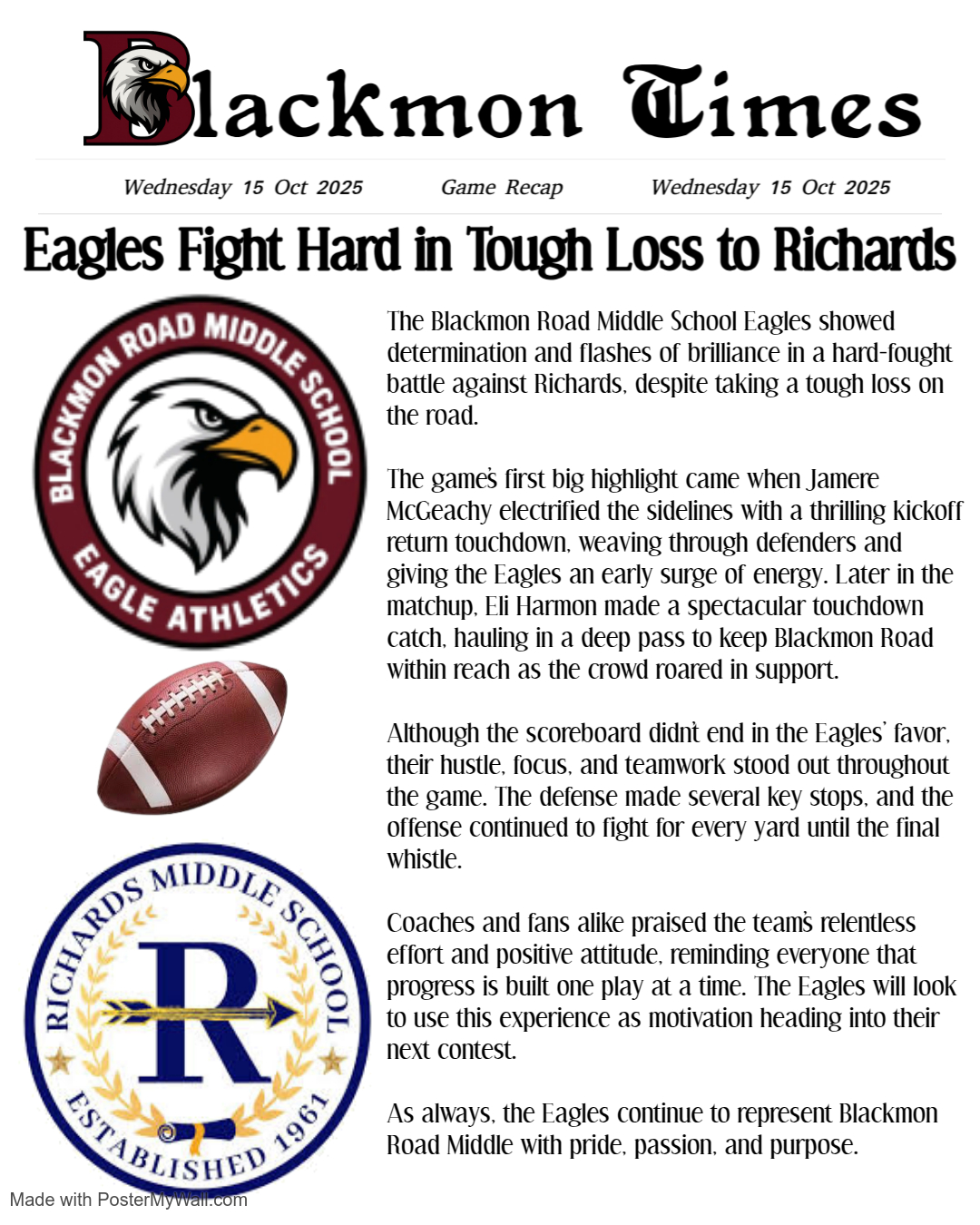 Blackmon Road Middle School interscholastic athletics provide an opportunity for the entire student body to demonstrate school spirit and positive citizenship. Our philosophy is to foster excellence through educational and competitive experiences in an atmosphere of sportsmanship and integrity.  The health and well-being of our student athletes is our primary consideration and is always more important than the outcome of an athletic contest.  We expect each of our student athletes to conduct themselves with dignity and decorum at all times.  Interscholastic athletic participation is secondary to the student’s academic responsibilities.  Practices and games are scheduled to avoid conflict with the academic class schedule, and a balance must be maintained between the demands of a competitive athletic program and the challenging academic schedule that all middle school students carry.  Interscholastic athletes