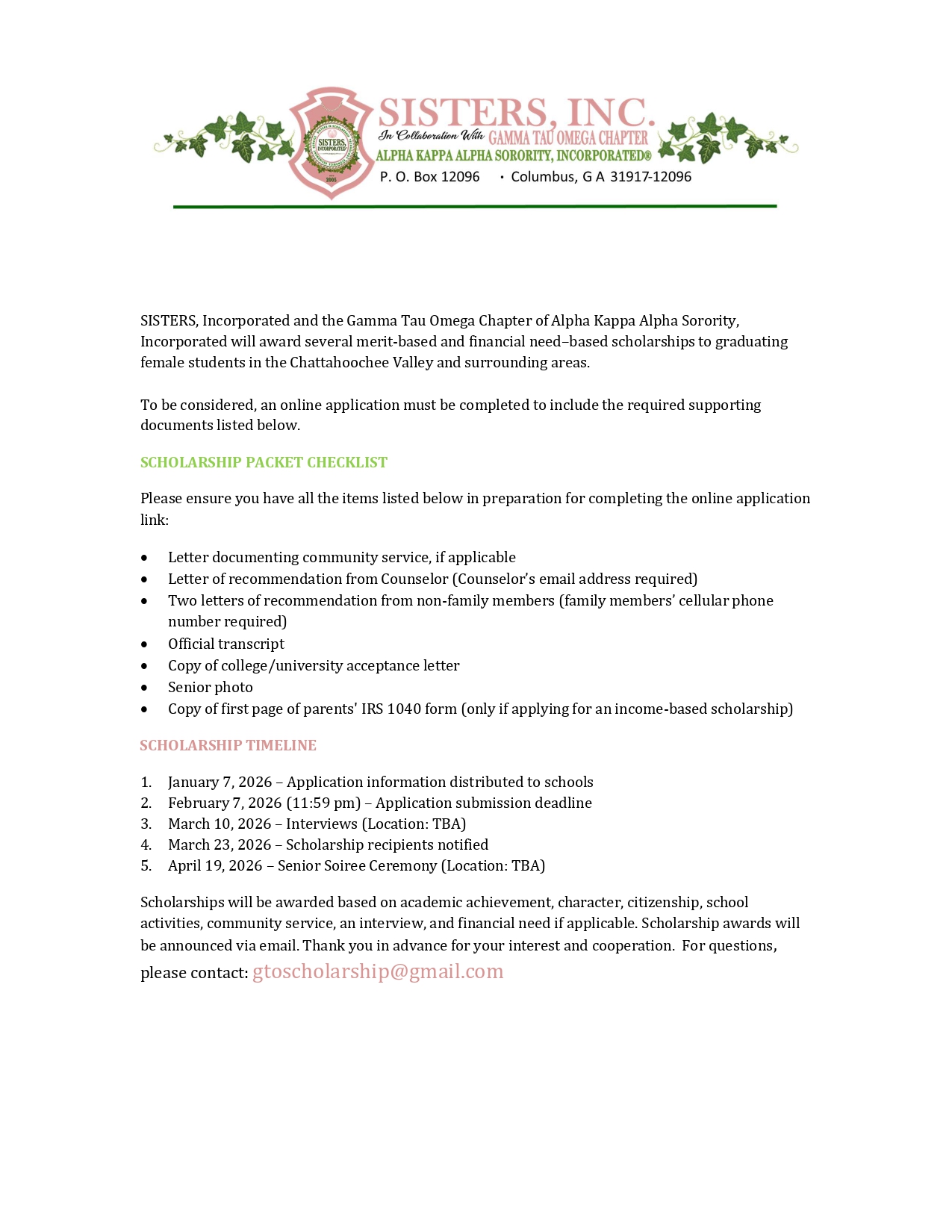 All nominations must be postmarked by or delivered in person by April 1, 2026 to the Dr. Melvin D. Matthews, Sr. Scholarship Committee, Lambda Iota Chapter, 9141 Midland Woods Dr., Midland, GA 31820.