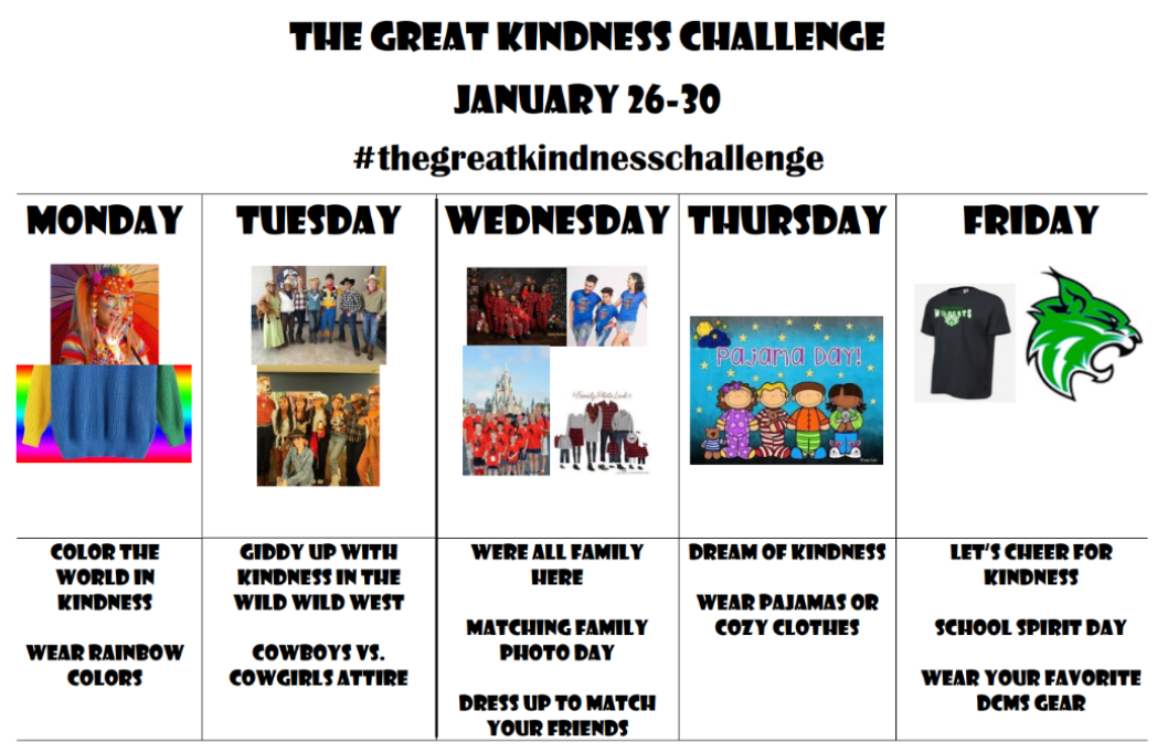 - Great Kindness Challenge: Wear DCMS Gear and/or Colors