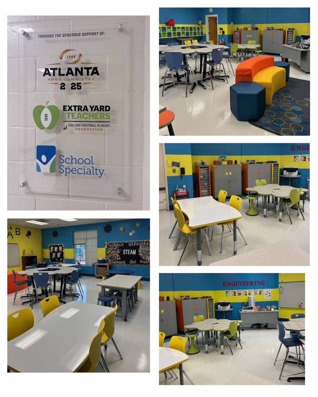 This year, the Engineering Lab received a significant upgrade thanks to a grant from the Extra Yard for Teachers – College Football Playoff Foundation. The CFP Foundation supports educators through resources, recognition, recruitment, and professional development. Through their generosity, Downtown Elementary Magnet Academy was gifted innovative, modern furniture designed to enhance both the look and functionality of the Lab and to further support student learning.