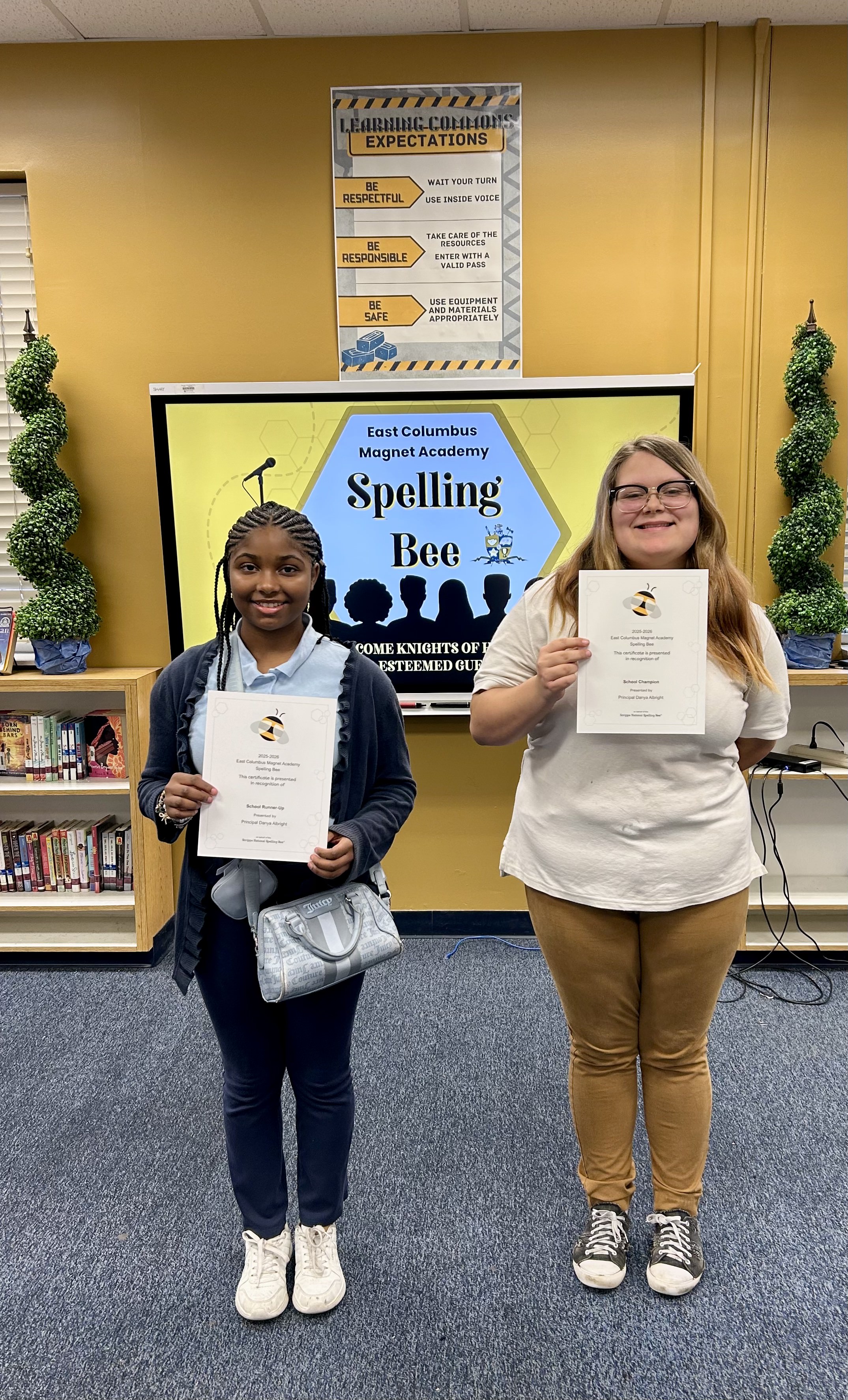 One winner and one alternate are selected from a school-wide competition where contestants are asked to spell English words. These winners advance to the district competition and from there even state and national level competitions.