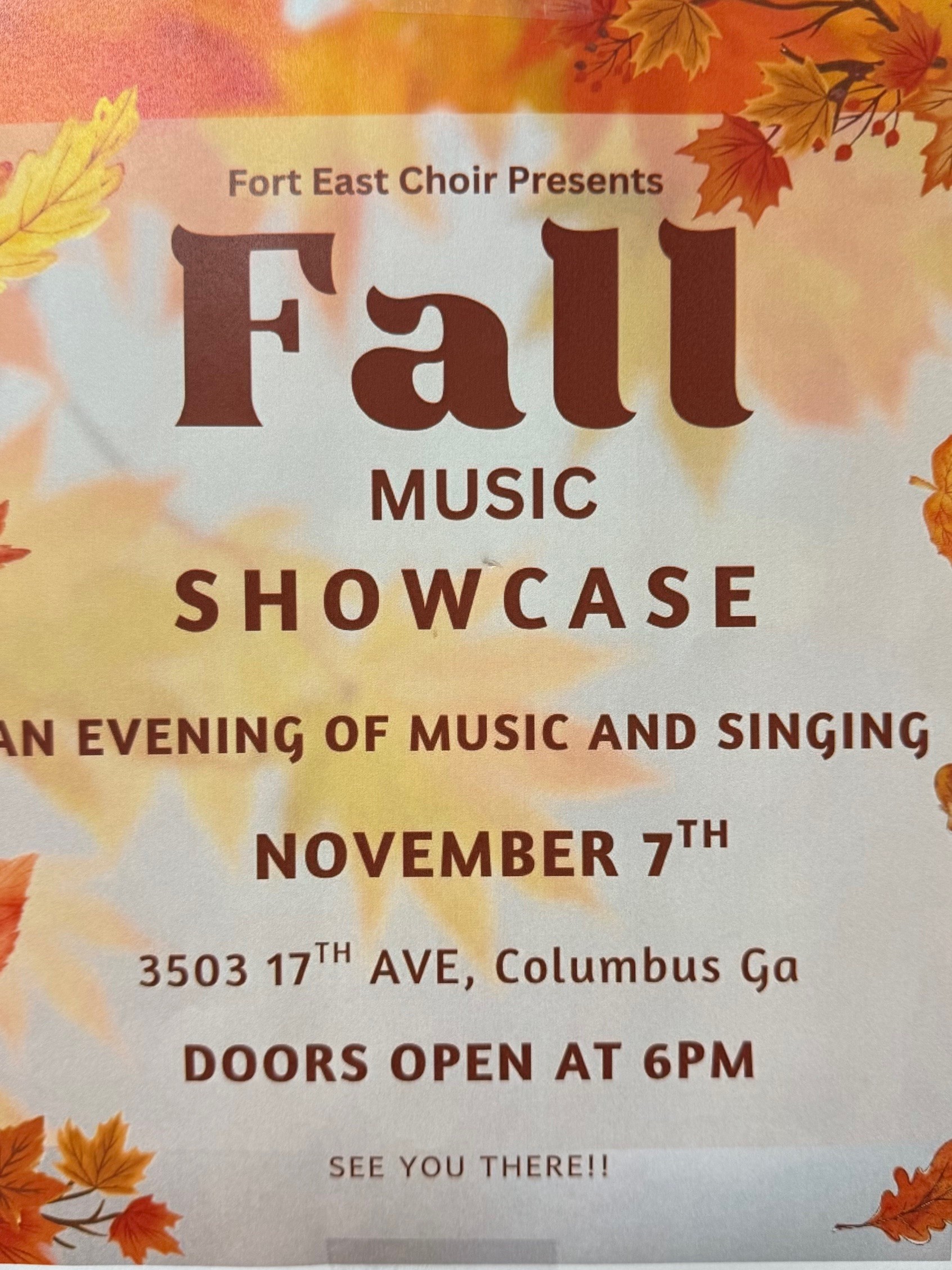 The Fort East Choir will be performing their Fall Music Showcase at 6pm on Friday, November 7th at 3503 17th Avenue in Columbus, Georgia. See flyer below for more details.