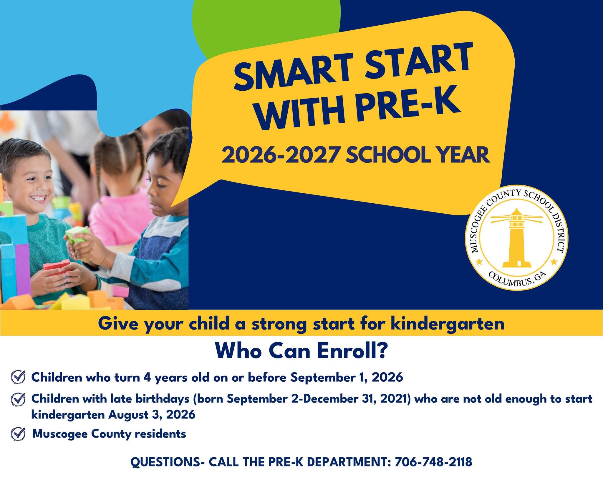 For additional information, please refer to the Muscogee County School District’s webpage for Pre=K or call 706-748-2118.