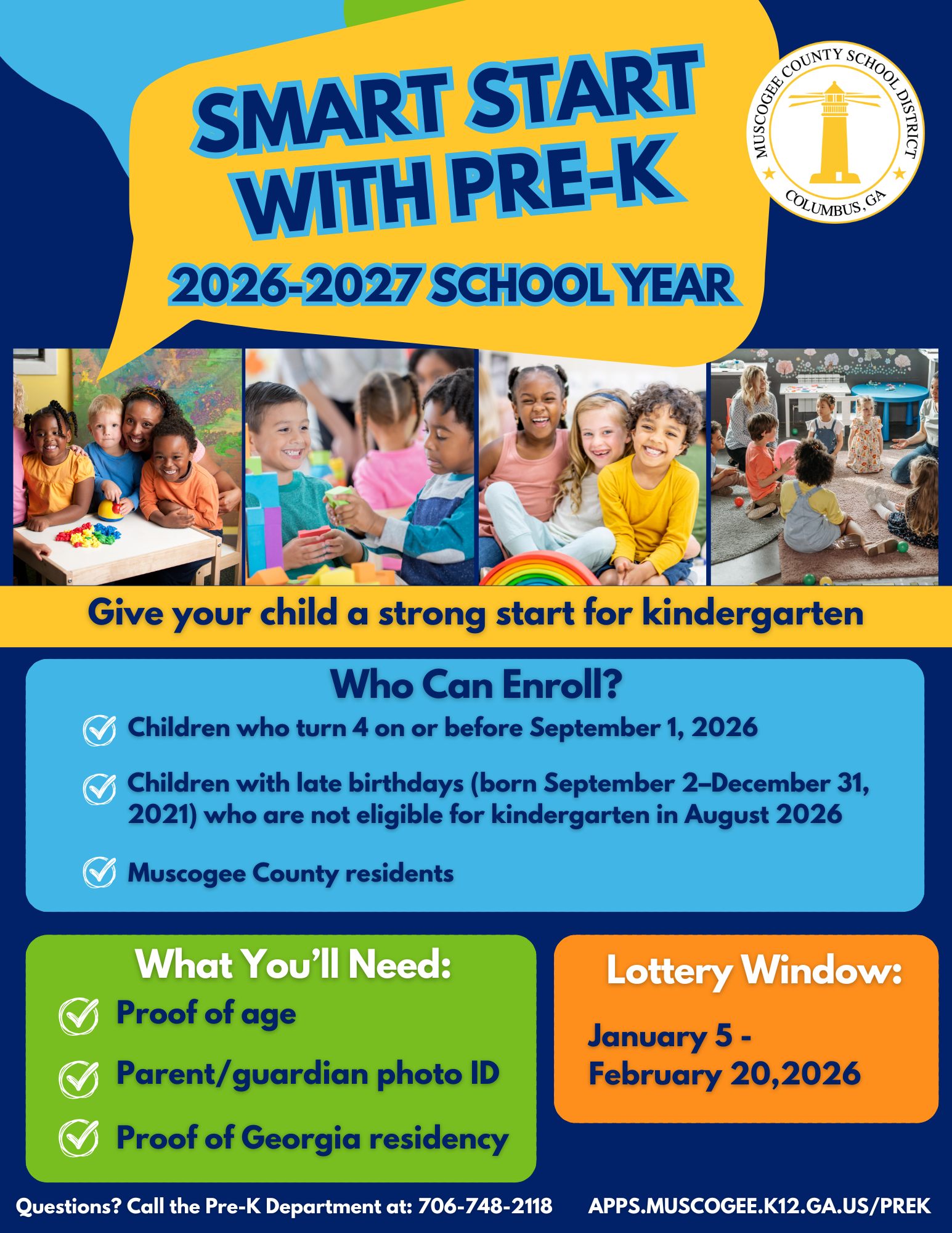 For any inquiries or additional information, contact the Pre-K Department at (706) 748-2118 or via email at prek@muscogee.k12.ga.us