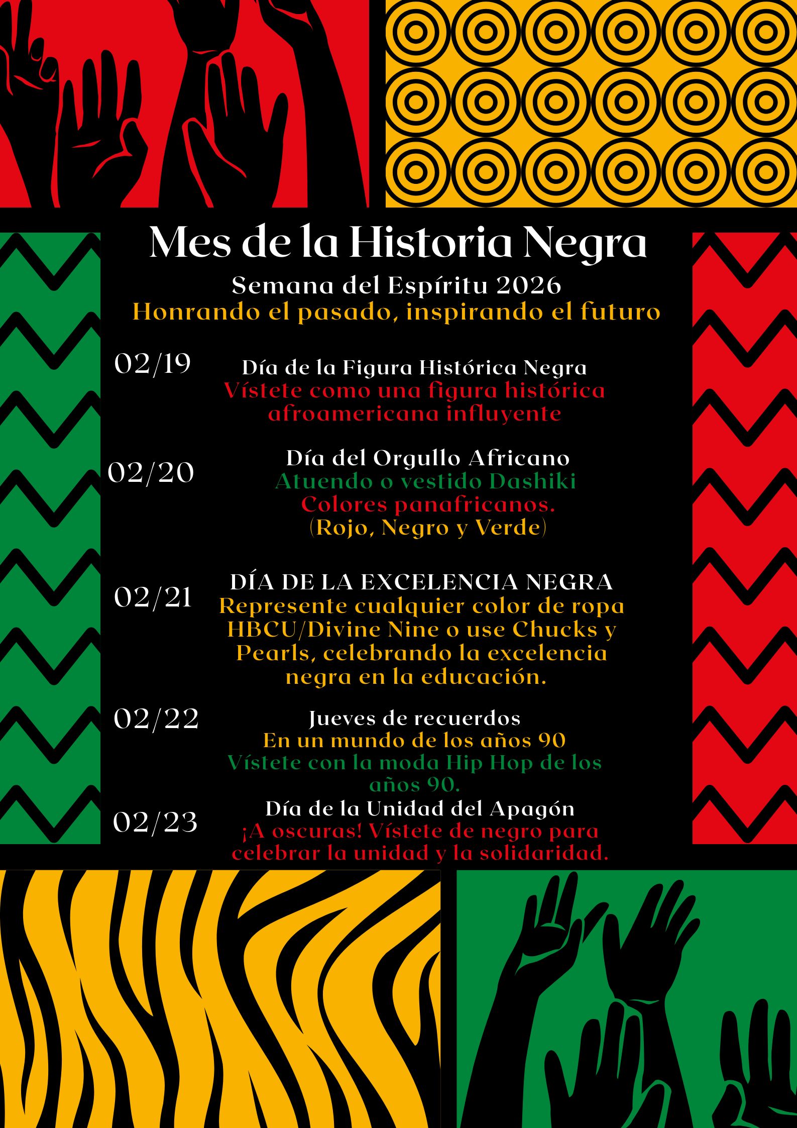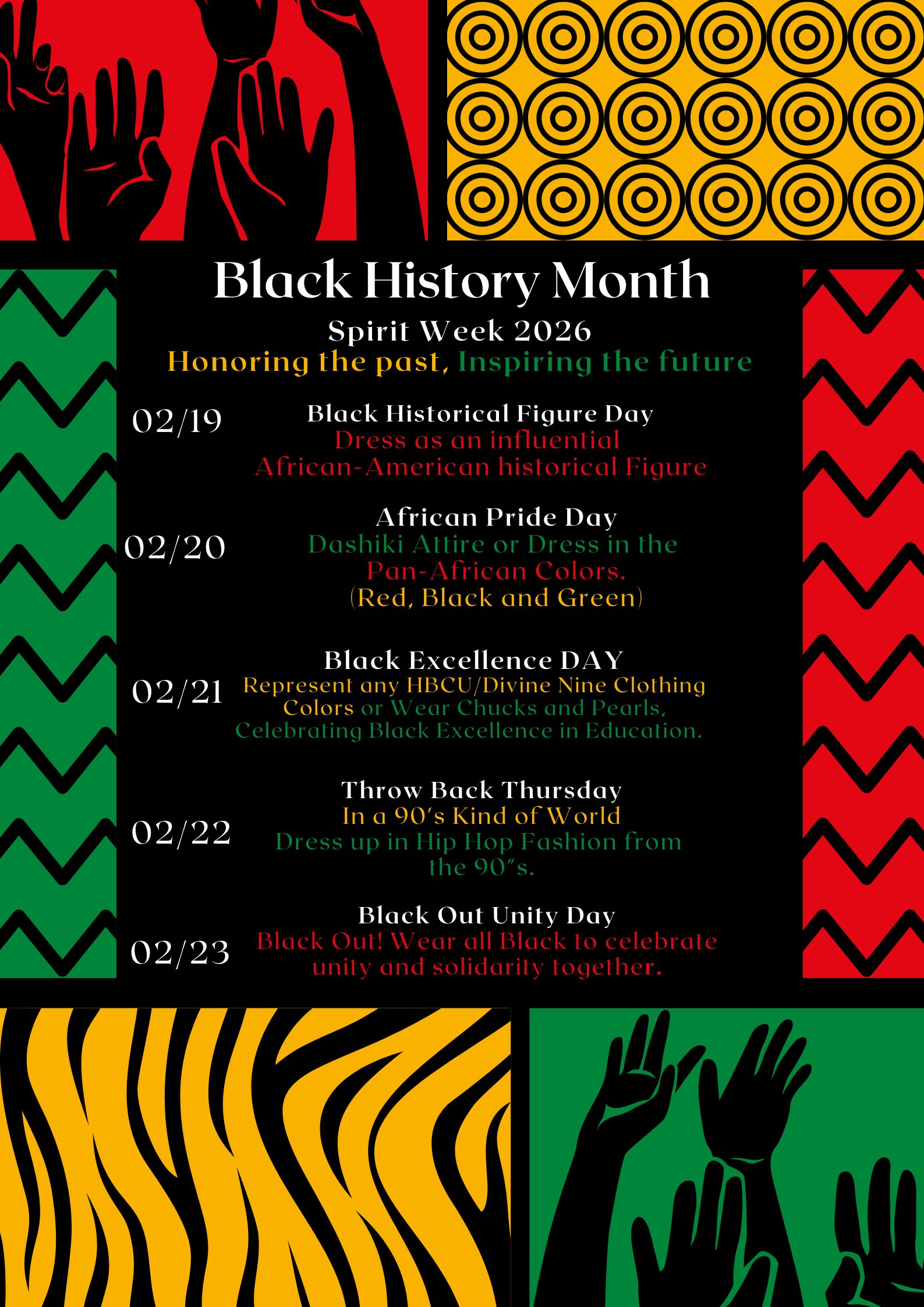 Please see the attached flyer for our lineup of themed dress-up days and events planned throughout the celebration. Each activity is designed to honor the history, achievements, and contributions of African Americans while promoting learning, reflection, and unity within our school community. 💙