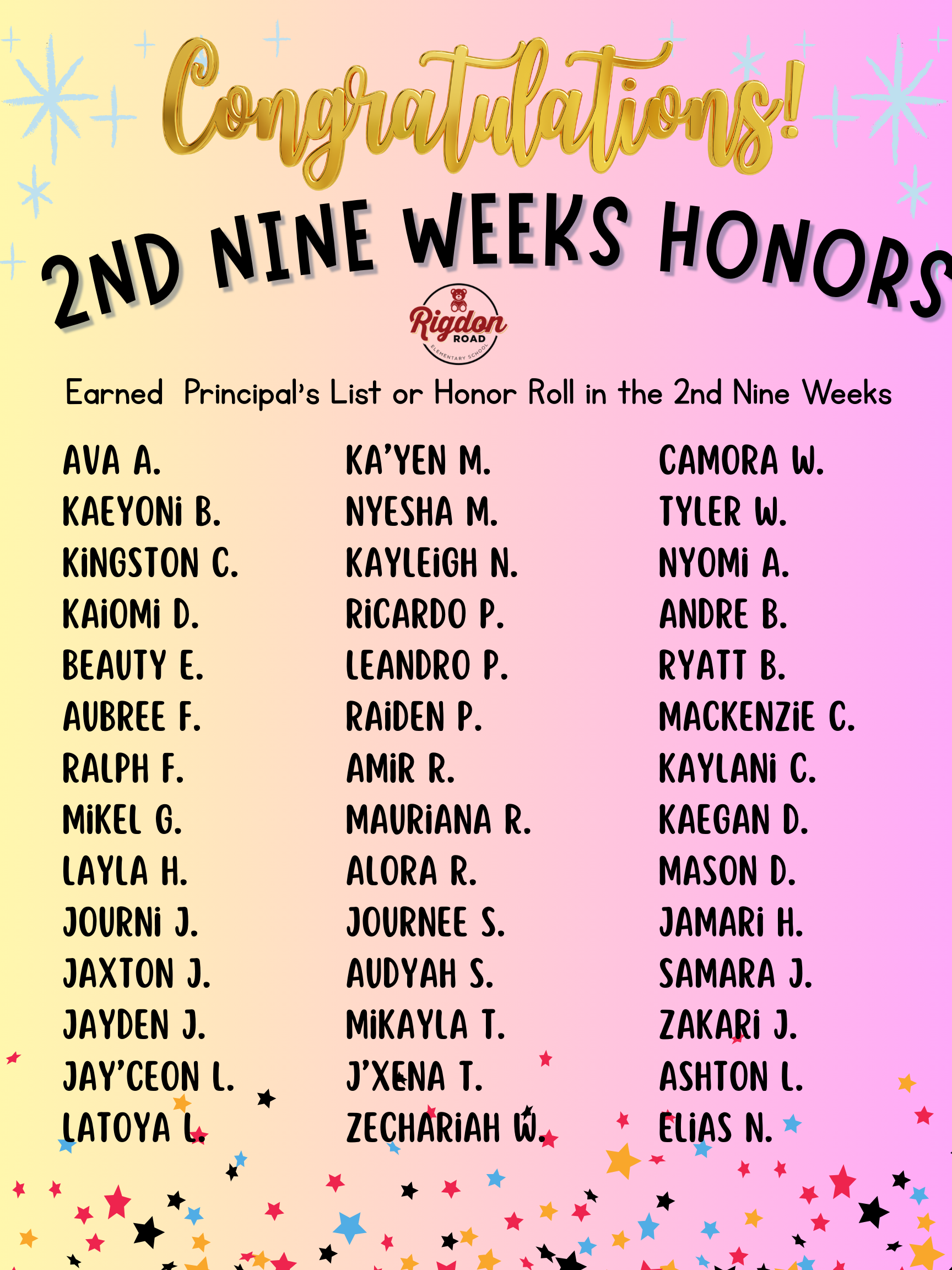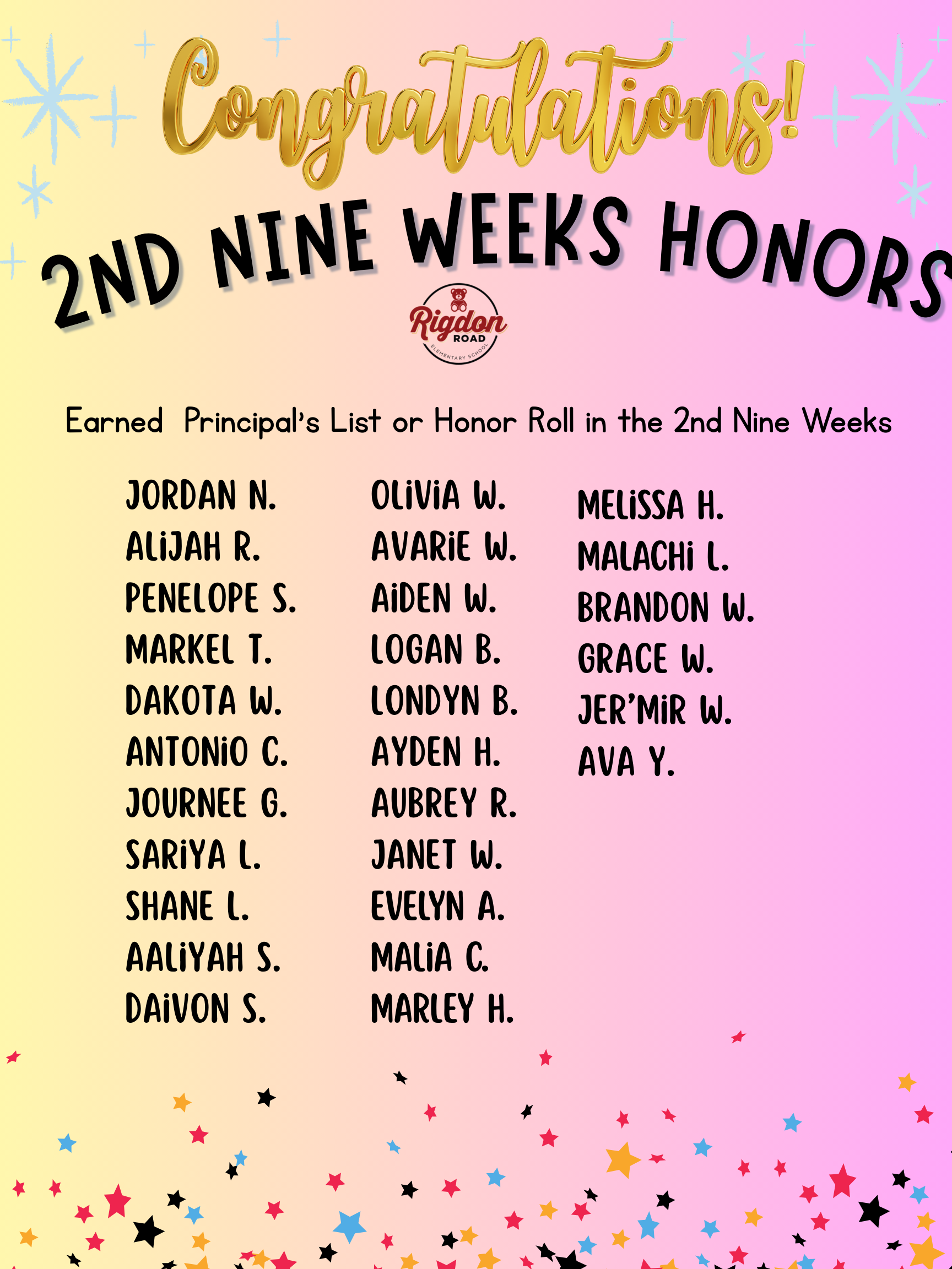 FollowFollow Mark your calendars! Dec. 22-Jan. 5, 2025 Winter Break Jan. 7, 2025 Report Cards Jan. 19, 2025 No school- MLK Jr. Day Jan. 24, 2025 Helen Ruffin Reading Bowl Feb. 6, 2025 Progress Reports Feb. 13, 2025 No school-Teacher planning 2nd Nine Weeks Honors WallCongratulations, keep up the great work!! 2nd Nine Weeks Honors WallCongratulations, keep up the great work!! Uniform Information 2025-2026 Rigdon Road ES Student Handbook Declaración de posición del MCSD MCSD Position Statement MCSD 25-26 Student Code of Conduct Chromebook Policy