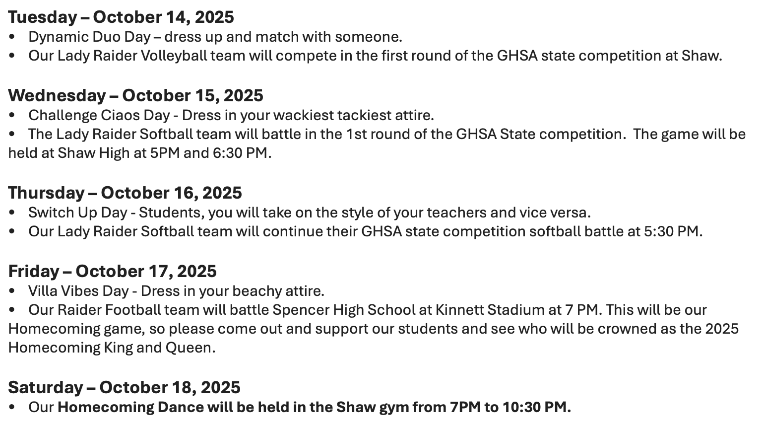 - October 17 Football vs Spencer @ Kinnett 7:00 – Homecoming Game
