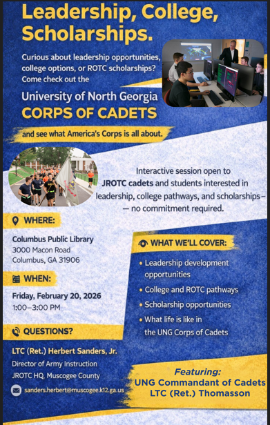 Curious about leadership opportunities, college options, or ROTC scholarships? Join the University of North Georgia Corps of Cadets for an interactive session designed for JROTC cadets and students interested in leadership, college pathways, and scholarships — no commitment required.